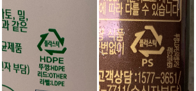냉장고에 있는 우유와 요구르트 용기를 확인해 봤어요. 비슷해보였는데 재질이 다른 플라스틱이네요.