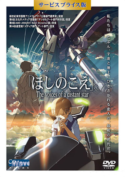 우주로 떠난 여고생과 지구에 남은 남자친구의 시간과 공간을 초월한 사랑 이야기. 메일로 서로의 마음을 전하는데 보낸 나이와 받는 나이가 다른 슬픈 러브스토리. 1인 제작 작품. 도쿄 애니메이션페어21 등 여러 차례 수상하며 이름을 알리기 시작. |